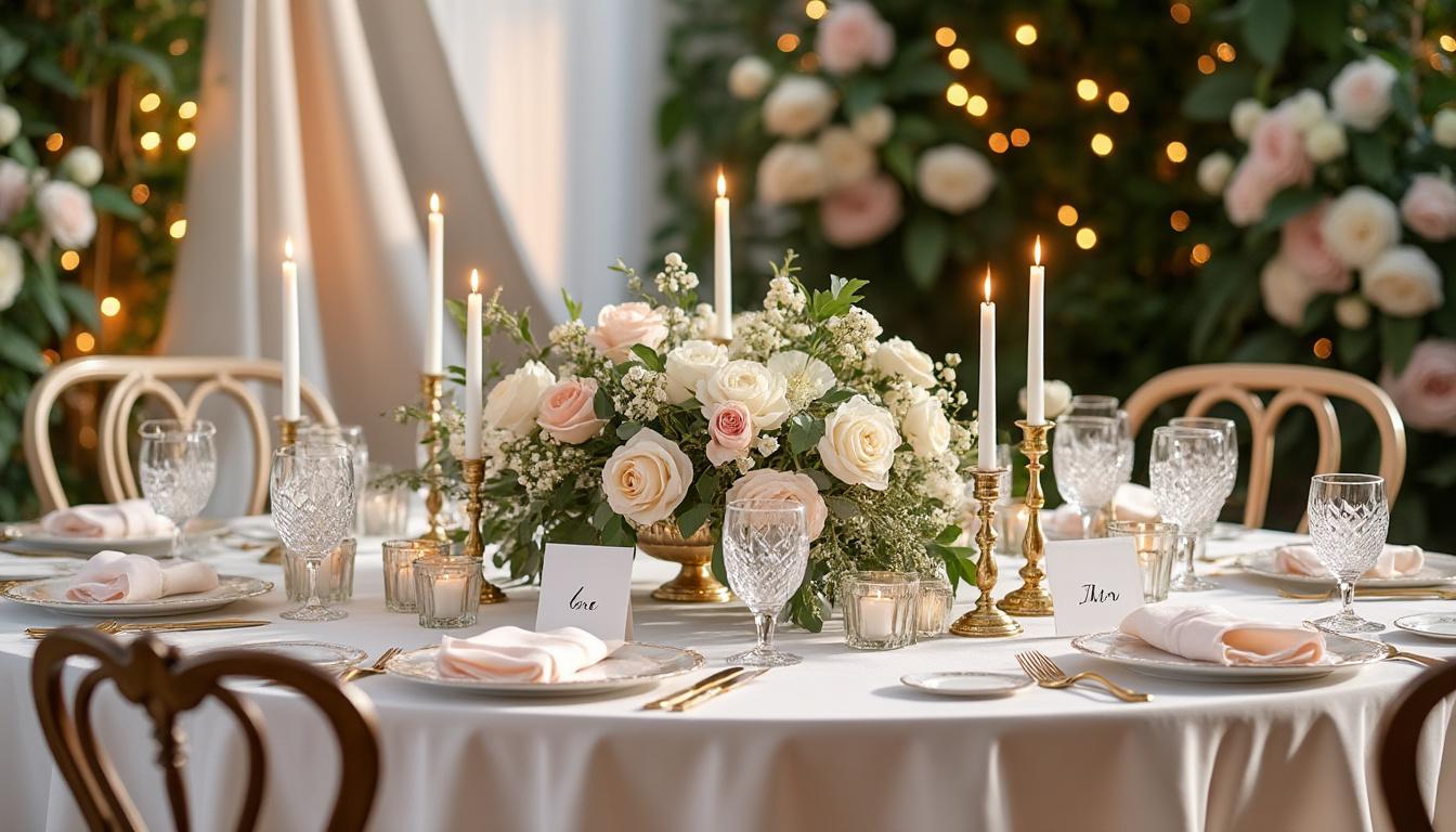 Enfin, le décor d’arrière‑plan fait toute la différence sur les photos. Un mur végétal, un rideau de voilage clair, une arche de fleurs, ou même une simple guirlande lumineuse bien positionnée transforment votre table en véritable scène. L’essentiel est de rester dans votre palette de couleurs et votre style : un mur de roses poudrées dans un décor minimaliste blanc, une arche de feuillage pour un mariage champêtre, ou un rideau satiné légèrement plissé pour une ambiance glamour.
